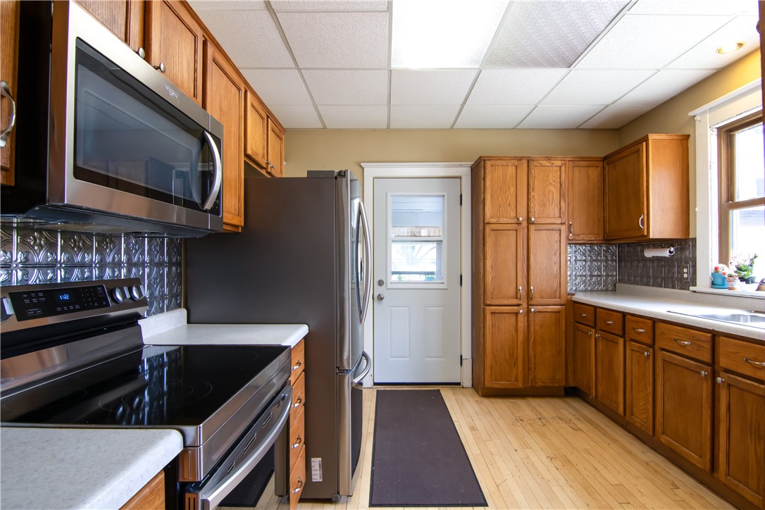 Kitchen has lots of cabinet space and stainless steel appliances.
