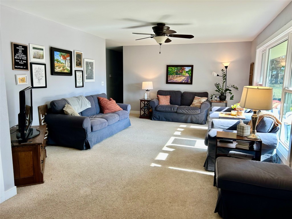 The living room has large southern facing picture windows that let in exceptional light while overlooking the spacious, private, fenced-in backyard.