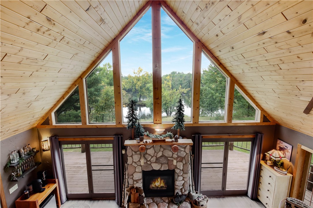 Peace and tranquility are yours at this chalet-style cabin on 21 forested acres with frontage on the Chippewa River — including a couple of private islands! Designed for year-round enjoyment, the cabin features three bedrooms, one bath, a stone fireplace in the living room with stunning views, and a 3-season porch overlooking the river.