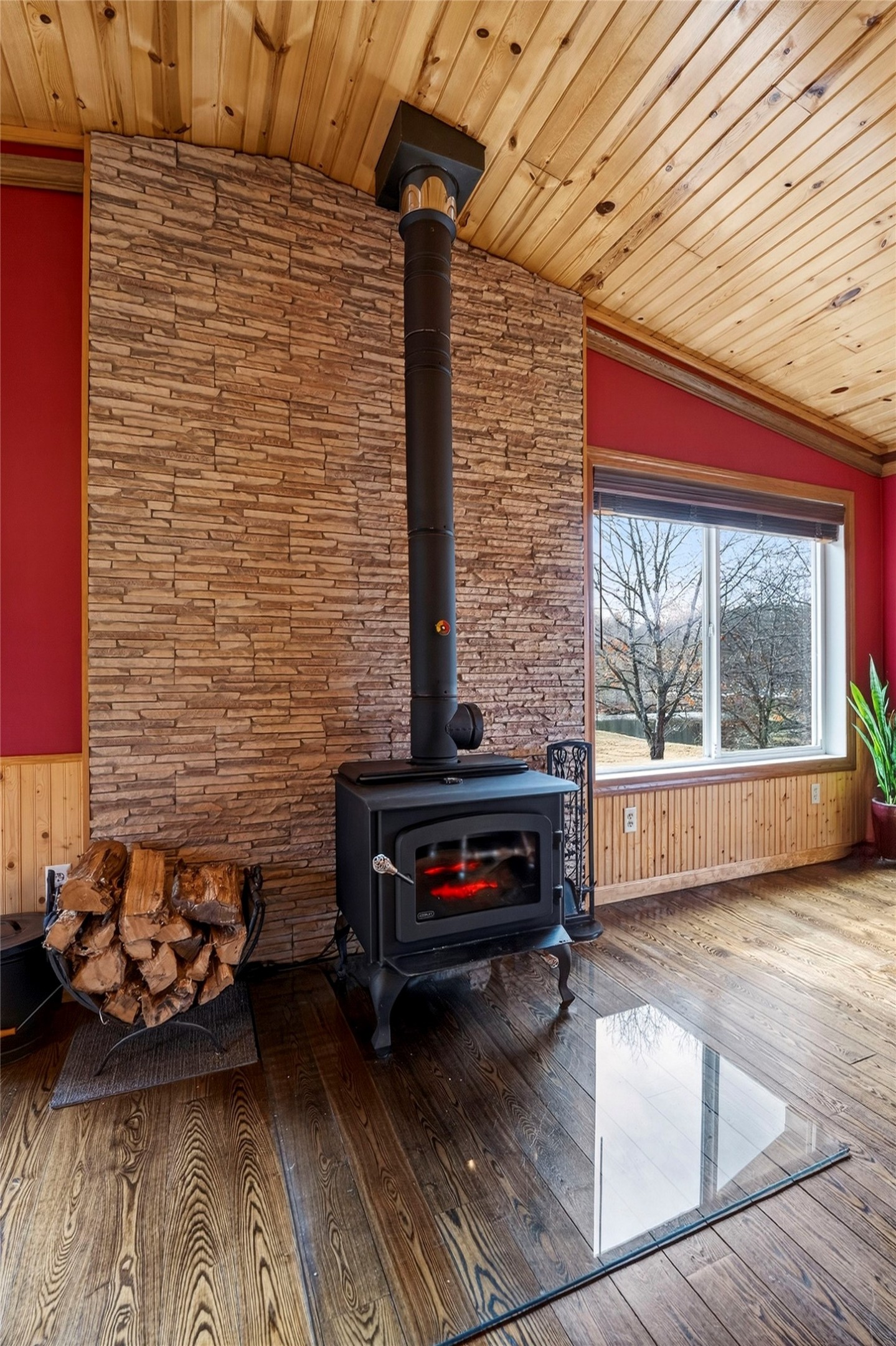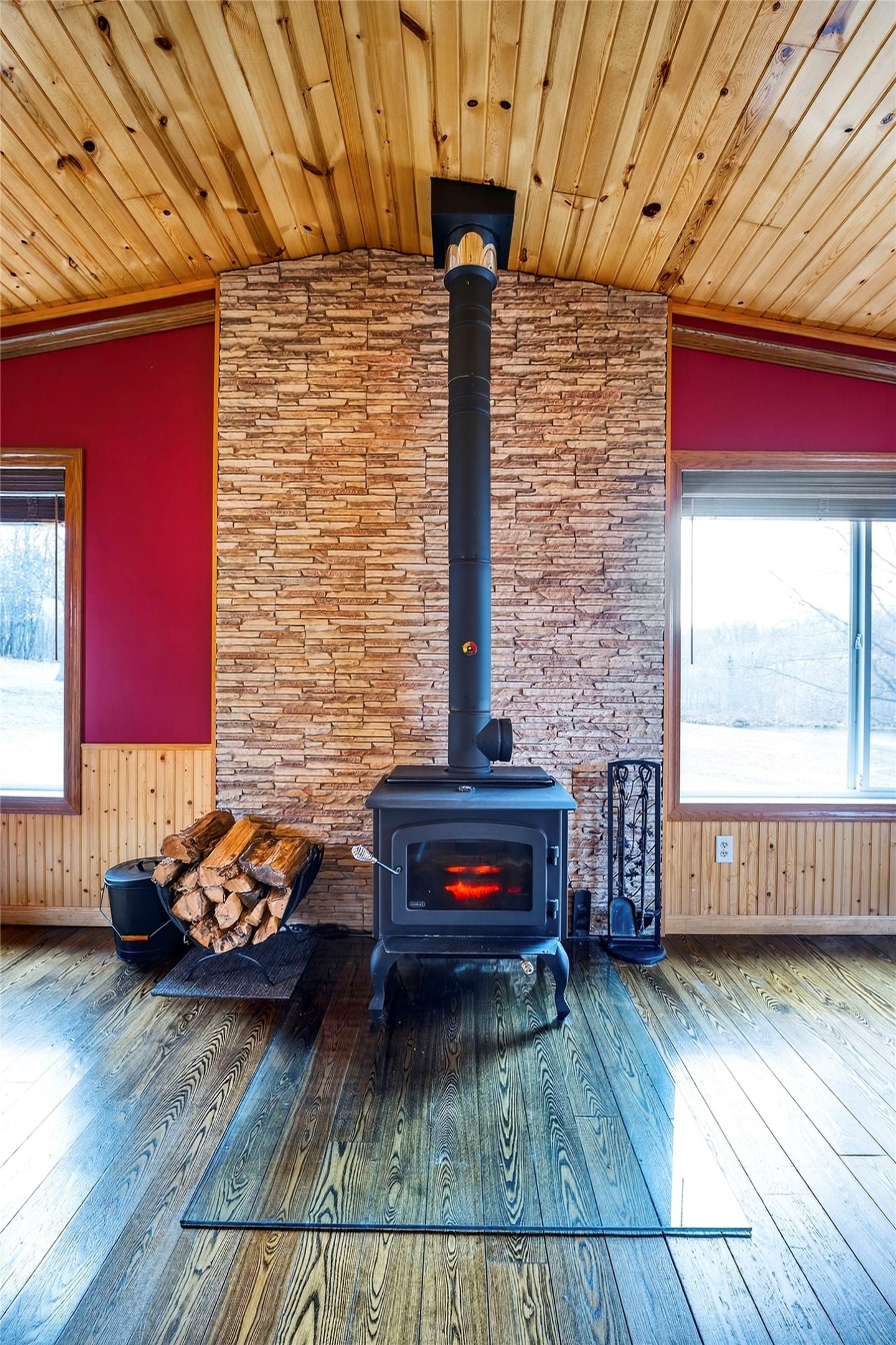 A premium woodburning stove serves as both a focal point and a source of warmth, creating a cozy, upscale Northwoods ambiance.