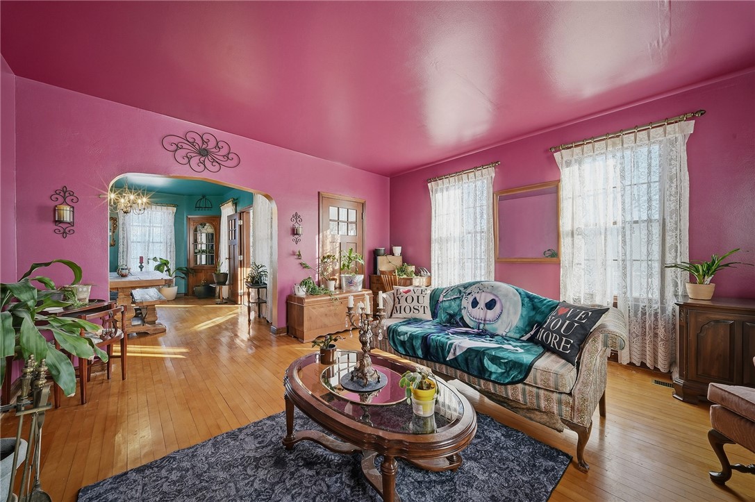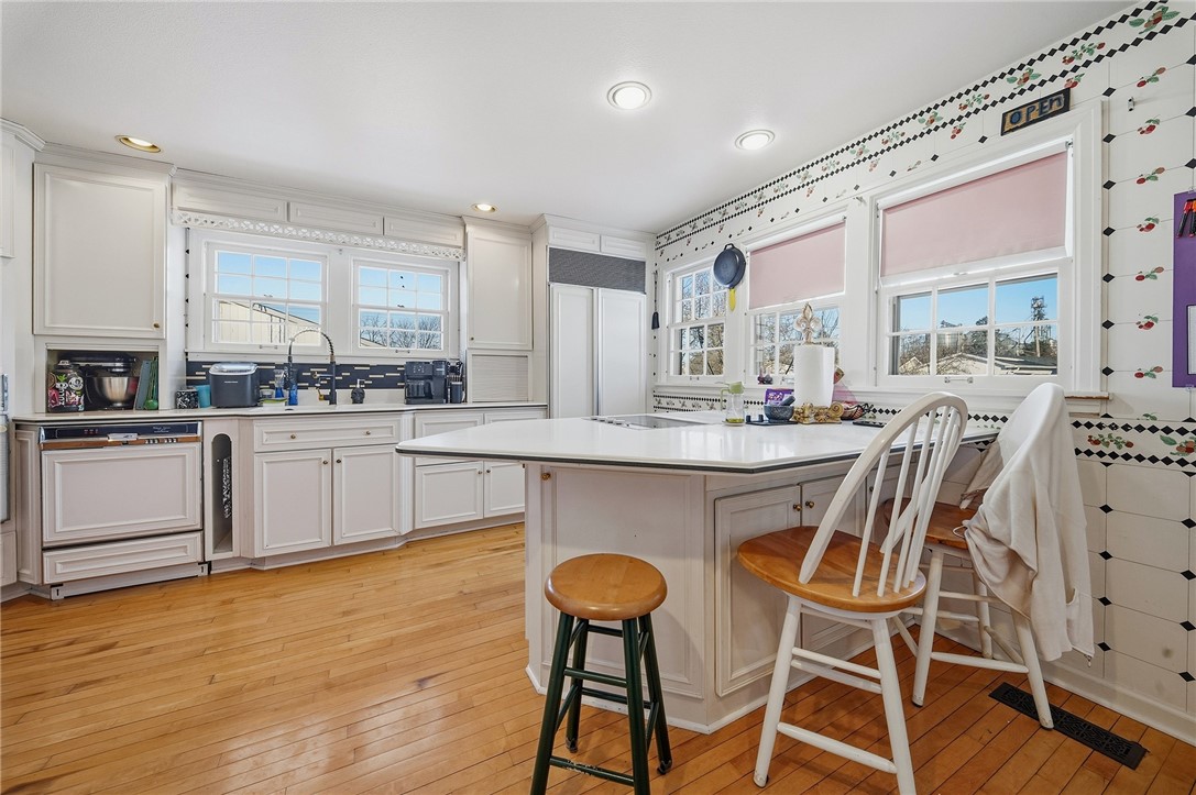 Hardwood flooring spans much of the main level, complemented by an abundance of windows that fill the home with natural light.