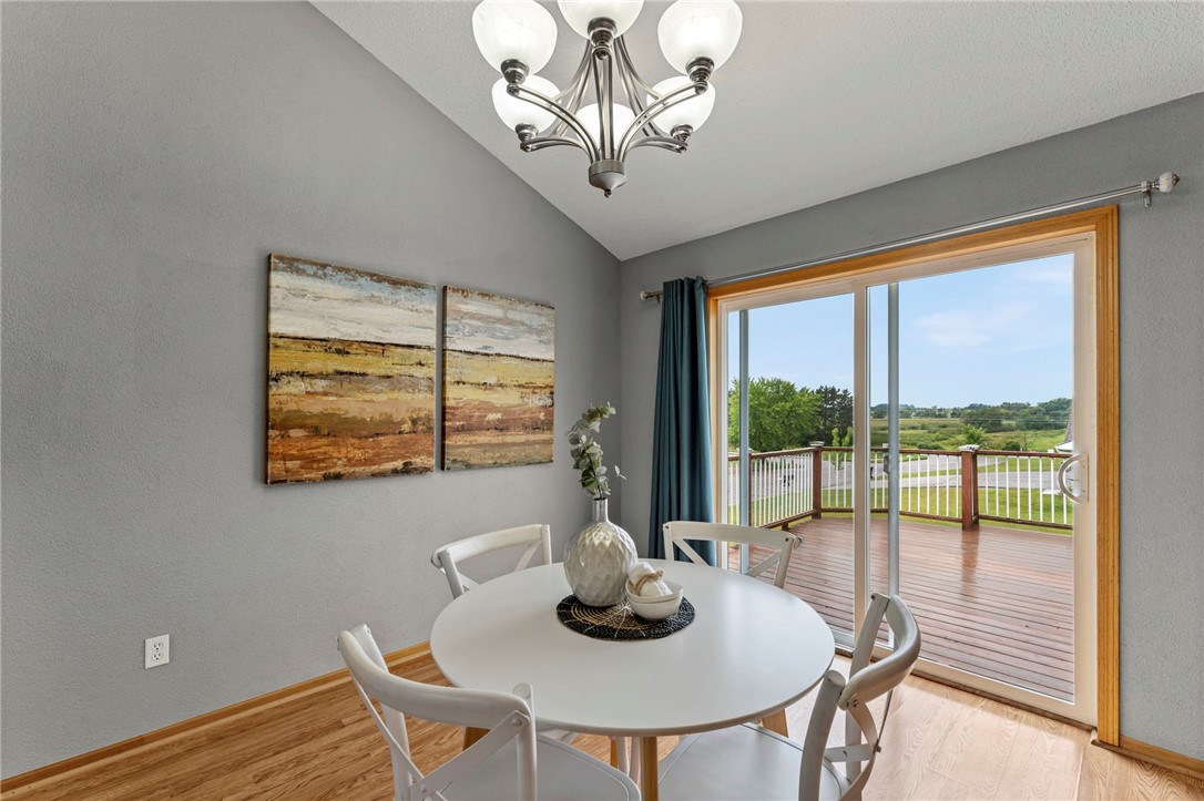 The open-concept upper level features vaulted 12’ ceilings, oak kitchen cabinetry, SS appliances, and a bright dining area with walkout to a 14x14 deck.