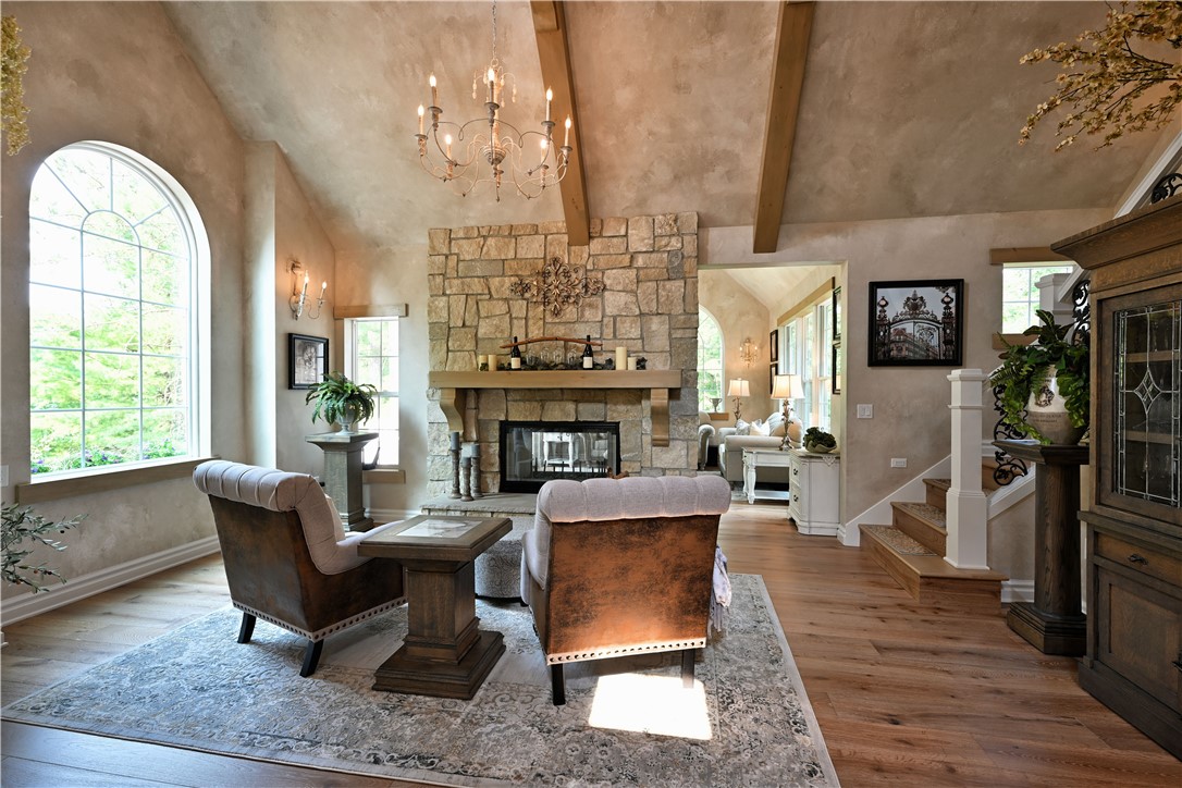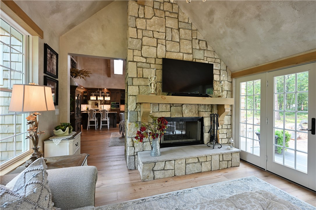 The home’s comfort is matched by its beauty, with a great room & sunroom sharing a majestic two-sided wood-burning stone fireplace.