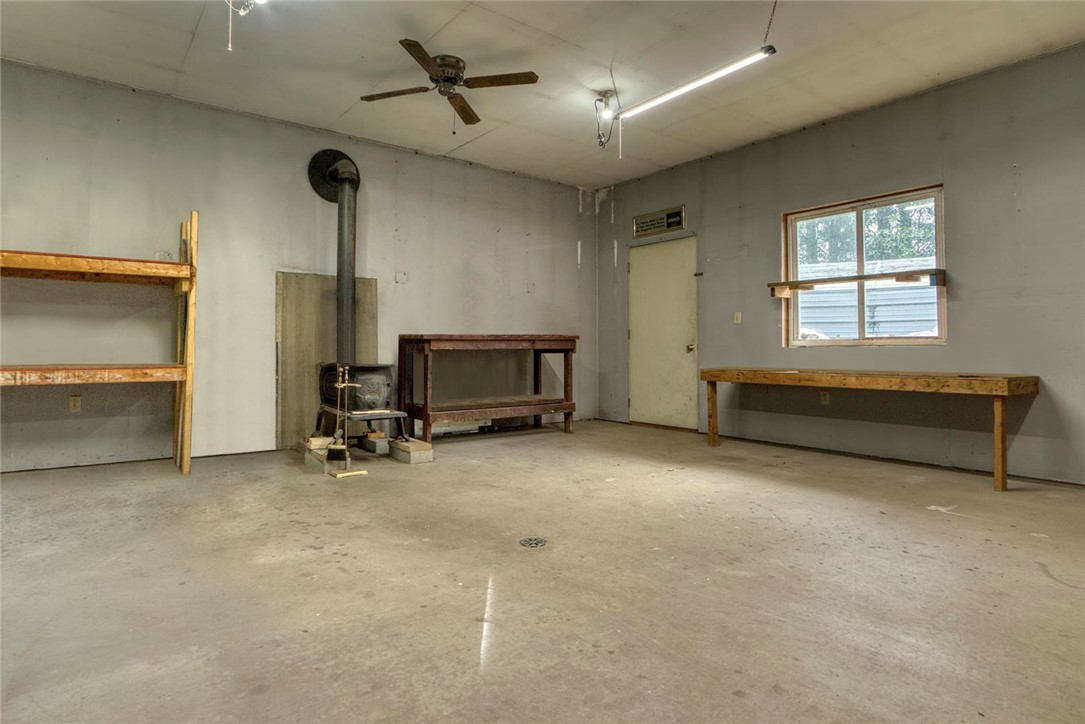 3-car garage (one space is heated) + a heated workshop that is 23'x19'.