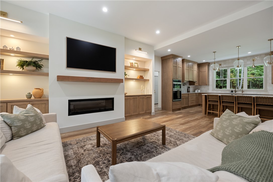 The open-concept kitchen is a chef's dream, featuring quartz countertops, a spacious quartz island, custom maple cabinetry, and premium LG appliances.
