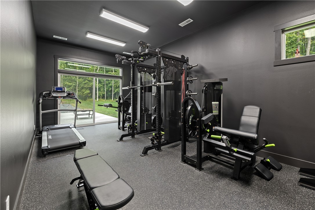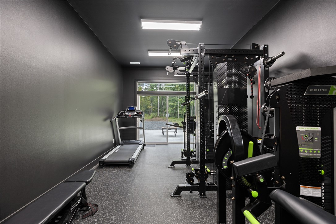 A versatile bonus space- currently a large gym room with a sliding patio door- offers potential as an additional living area, den, or home office.