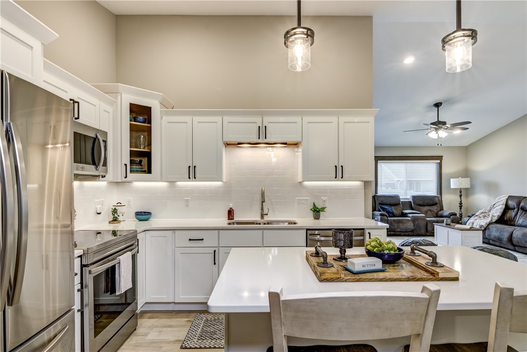 Stylish kitchen with stainless-steel appliances, backsplash, island with breakfast bar, and under cabinet lighting to really brighten up the space.