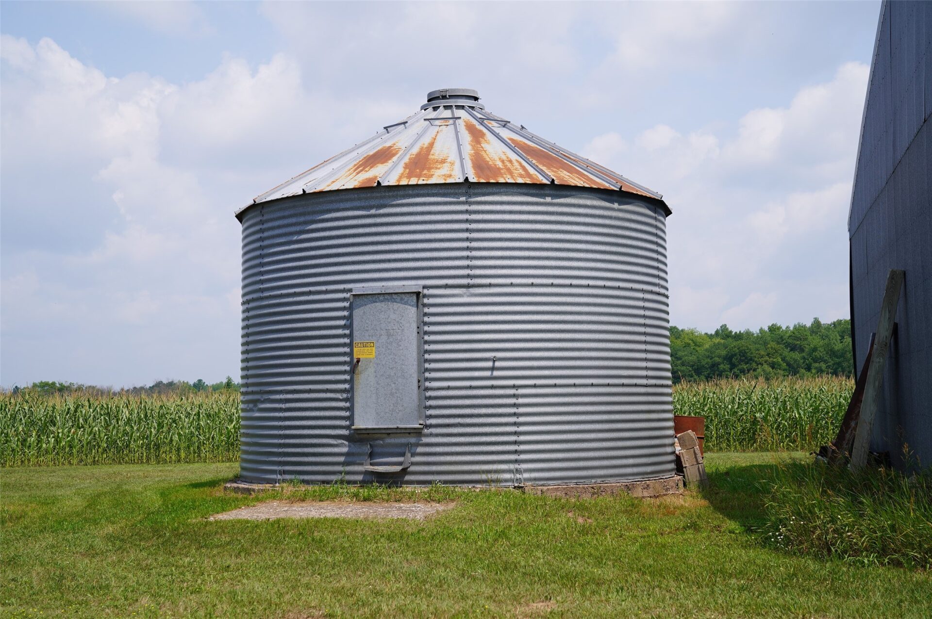 Existing agricultural infrastructure includes grain bins, a harvester silo, and two cement stave silos.