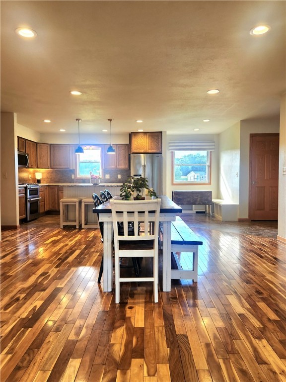 The dining and living room feature Asian Walnut hardwood floors.