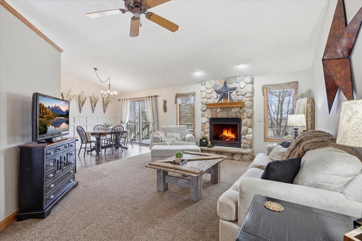 Inside, an inviting open layout creates a warm, welcoming atmosphere, anchored by a cozy gas fireplace.