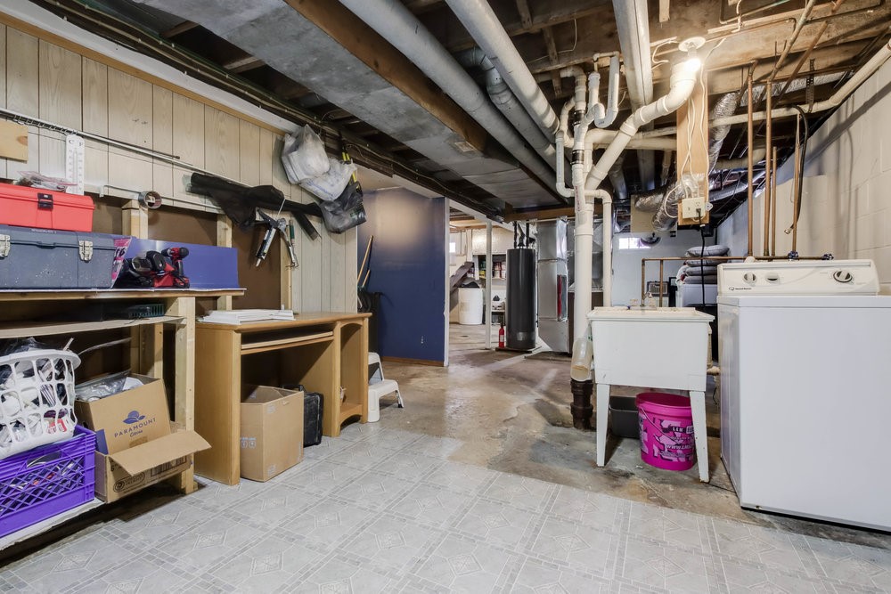 The lower level is open and unfinished; a blank canvas offering potential for additional finished square footage, workshop space, or storage.