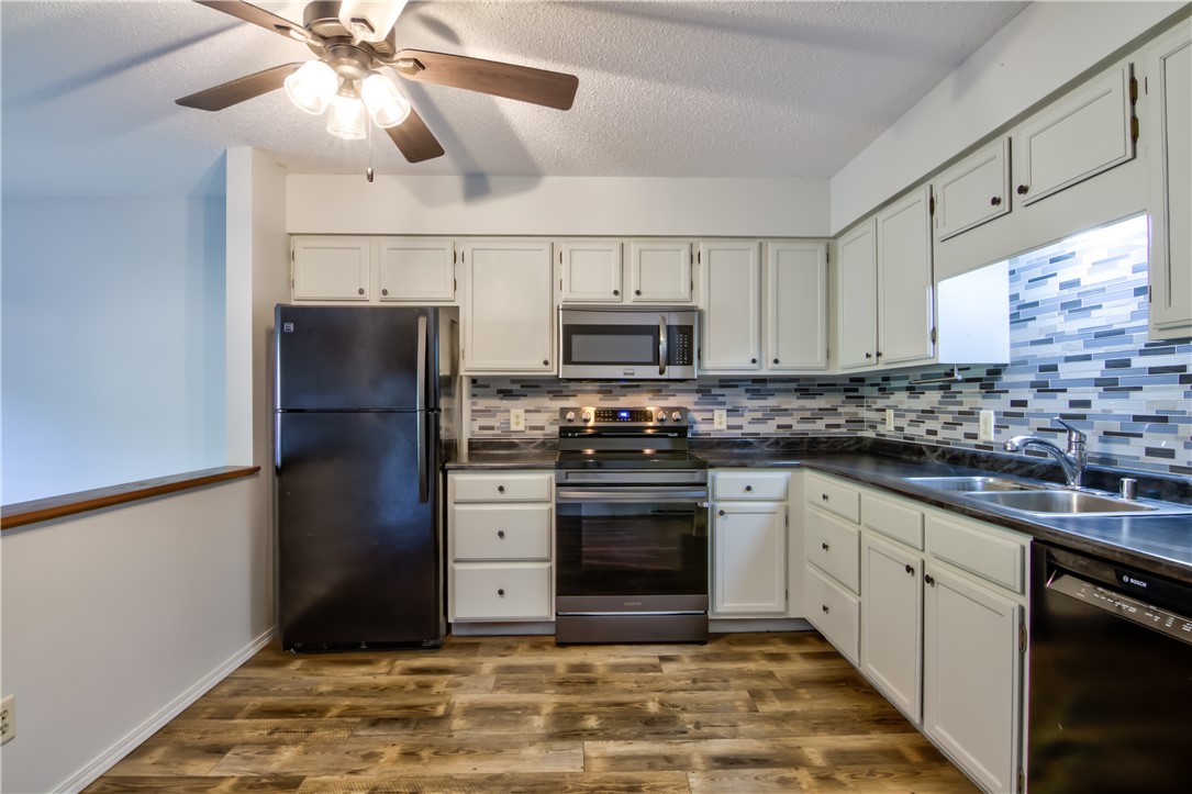 The kitchen has been stylishly upgraded with a new backsplash and under-cabinet lighting, making it a great space for cooking and entertaining.