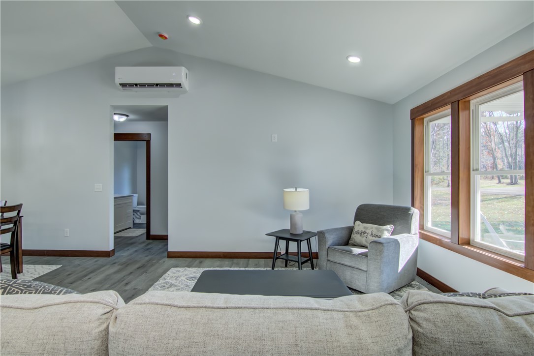 The home features vaulted ceilings in the living room, dining area, and kitchen.