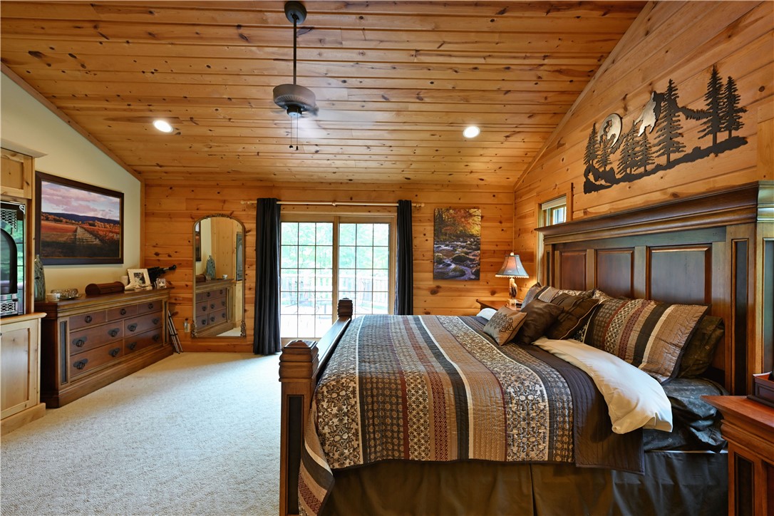 Tucked in the Southern cove of Red Cedar Lake, this 4 bedroom, 3 bath log home on over 12 acres, and 1,076 ft of lake frontage is the dream home you've been waiting for! Enjoy the ambiance right when you step inside with vaulted ceilings, log beam accents, and the gorgeous stone fireplace in the main living area.
