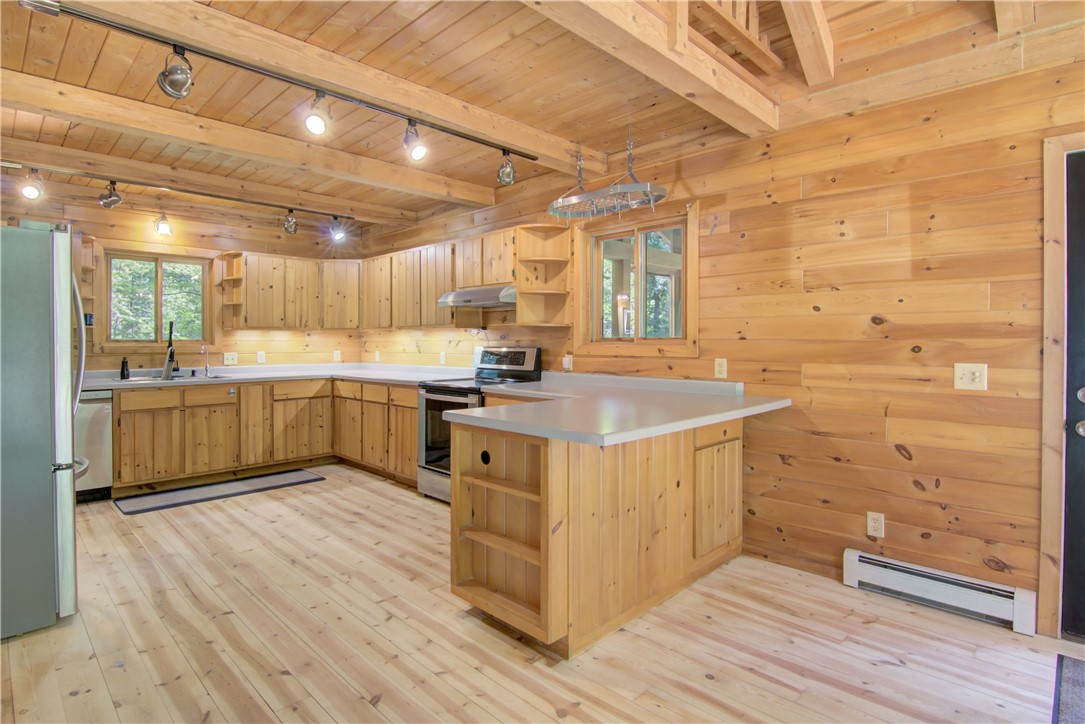 The home features a dramatic 20-ft vaulted living room with a floor-to-ceiling stone fireplace, Stainless Steel appliances, pine plank ceilings, walls and floors for a warm rustic feel.