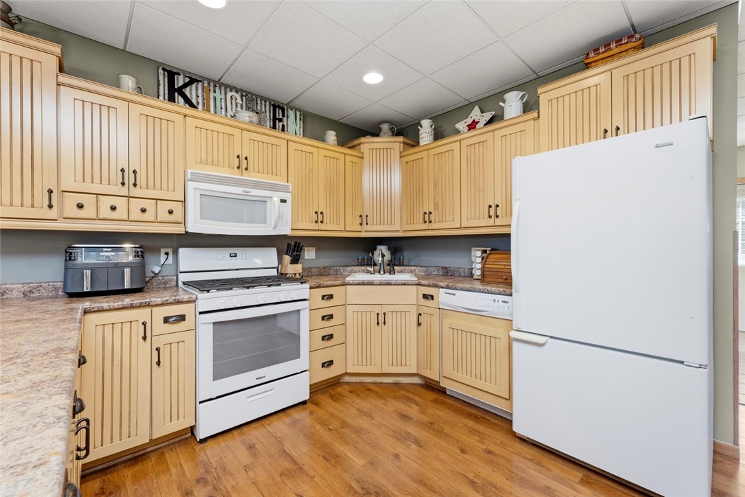 The 2-bedroom, 1-bath home sits behind a massive 40x40 heated attached garage/shop with 14' ceilings, ideal for hobbyists, hunters, or anyone needing serious workspace.