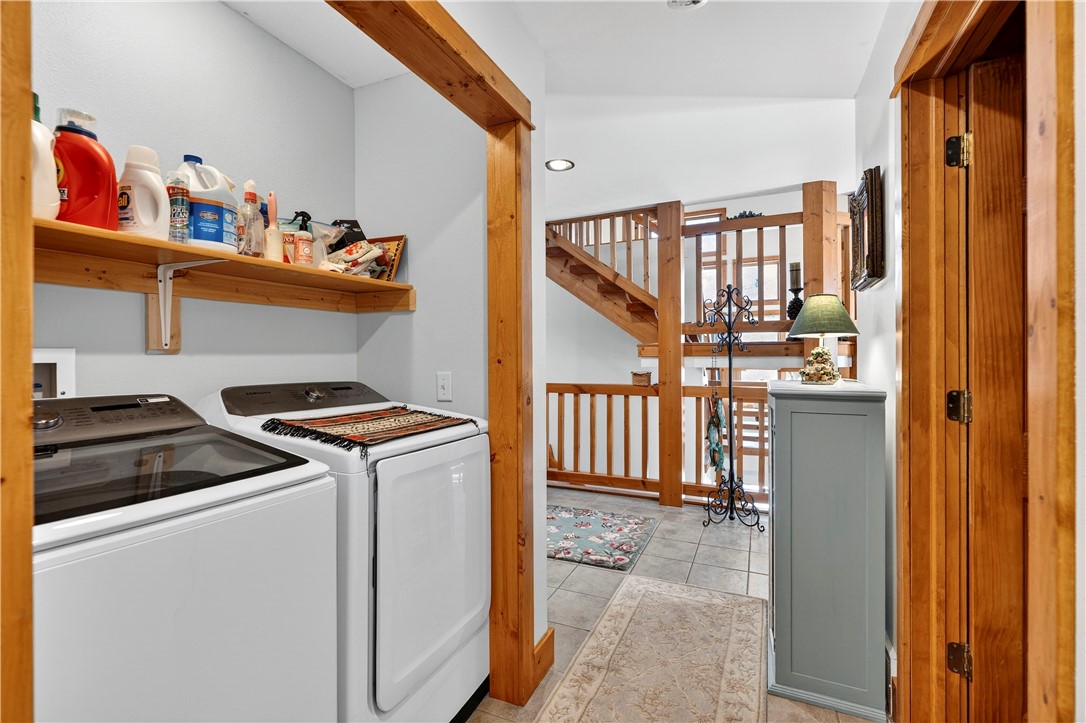 A handcrafted timber-frame staircase & railing (custom designed & built by Dobiehill Timberworks exclusively for this home) serve as a striking architectural centerpiece.