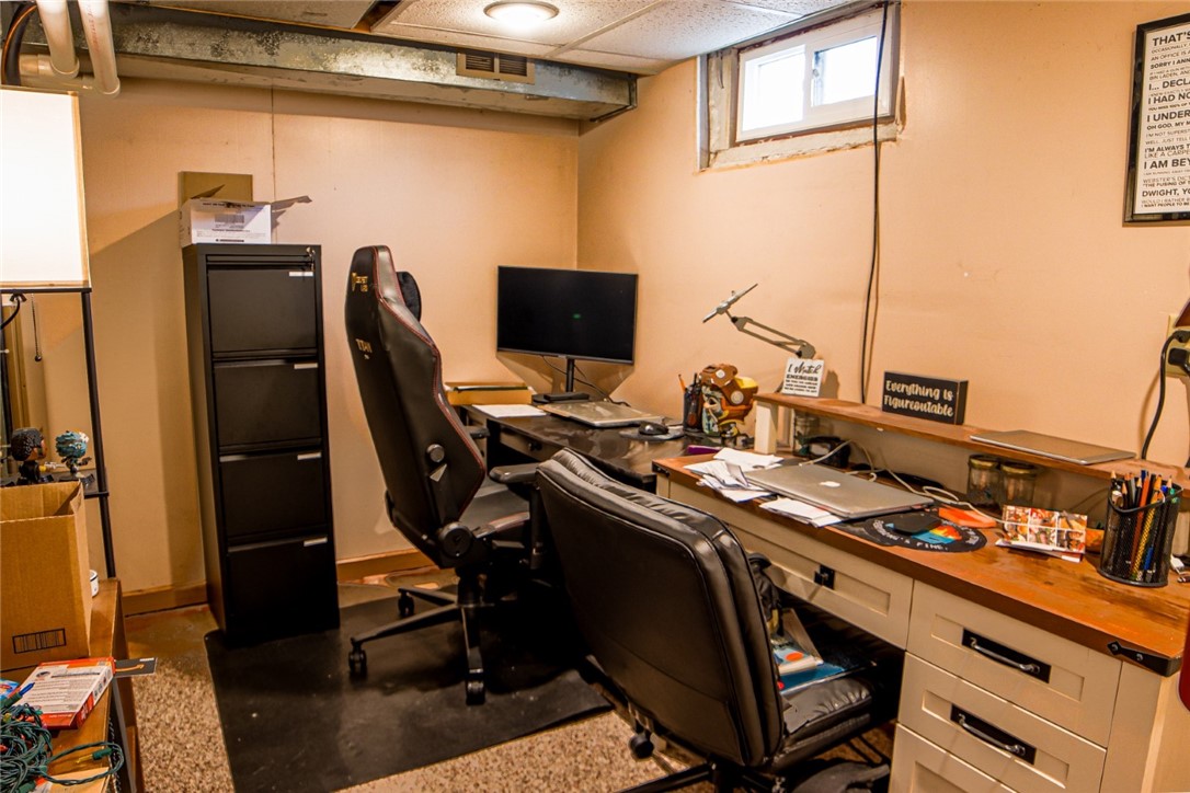 The lower level family room provides a dedicated area that could easily be transformed into a dry bar by the next owner, offering even more versatility.