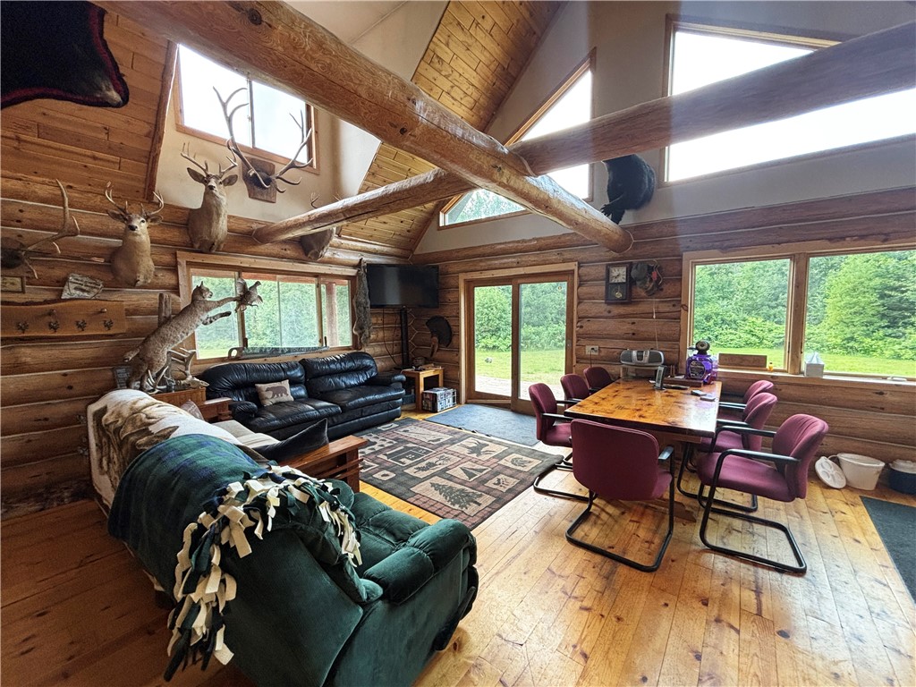 Inside, you will find log accents and an open-concept main level flowing between kitchen, dining, and living areas.