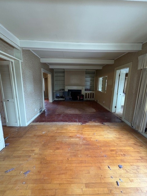 Hardwood floors are located under the carpet, and the living room features exposed beams and original woodwork, including built-in shelving.