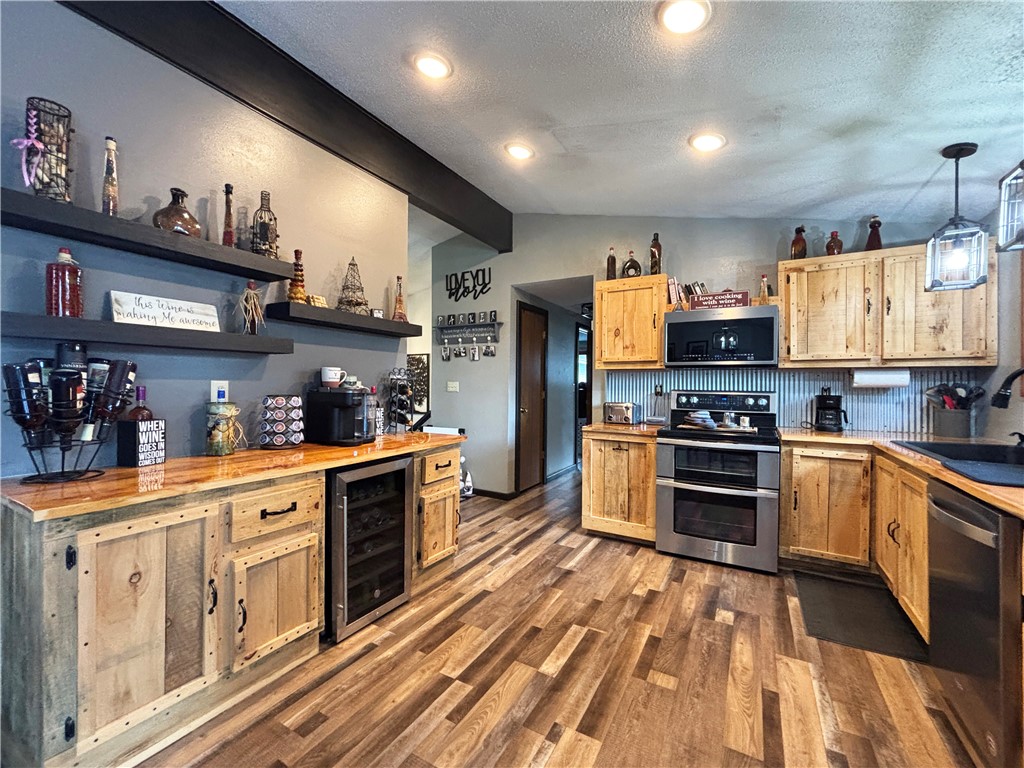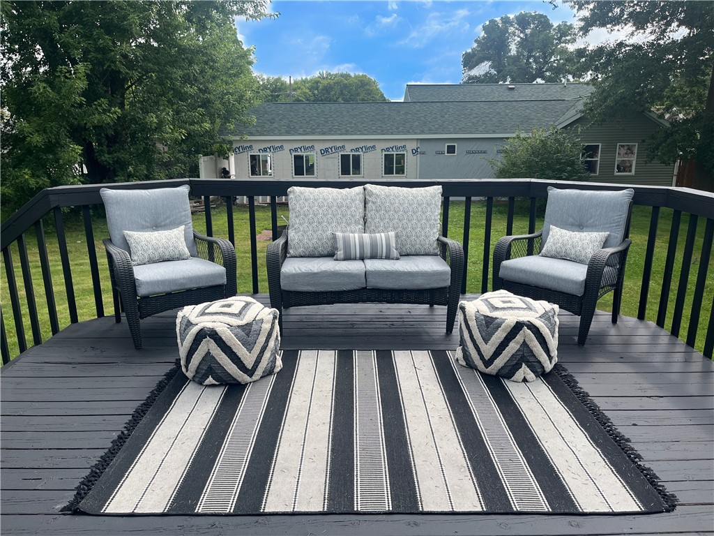 Enjoy an open-concept layout with a stylish kitchen featuring stainless steel appliances, a coffee bar, and seamless flow into the dining area with deck access, perfect for relaxing or entertaining.