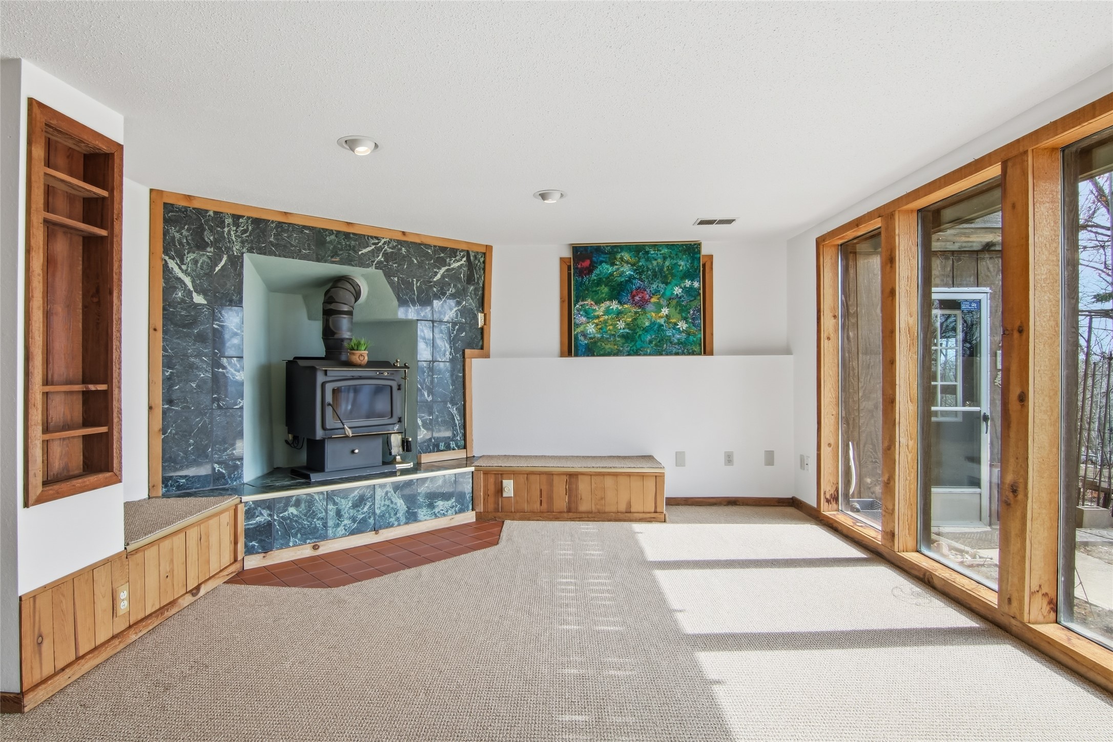 The walkout lower level continues to impress with more expansive windows, a cozy family room with a wood burning stove, a second bedroom, full bath, and generous storage space.