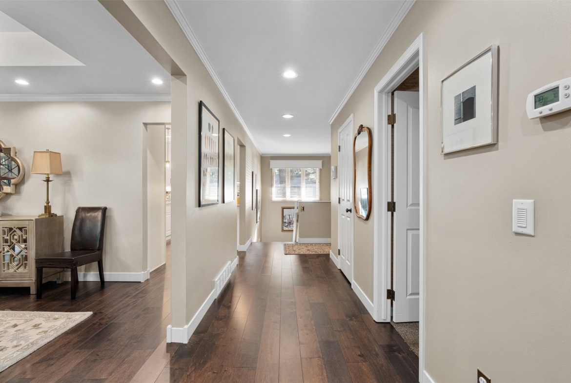 The extensively remodeled, high-end chef’s kitchen showcases quartz countertops, a center island with sink, gas range, bar refrigerator, and superior craftsmanship throughout.