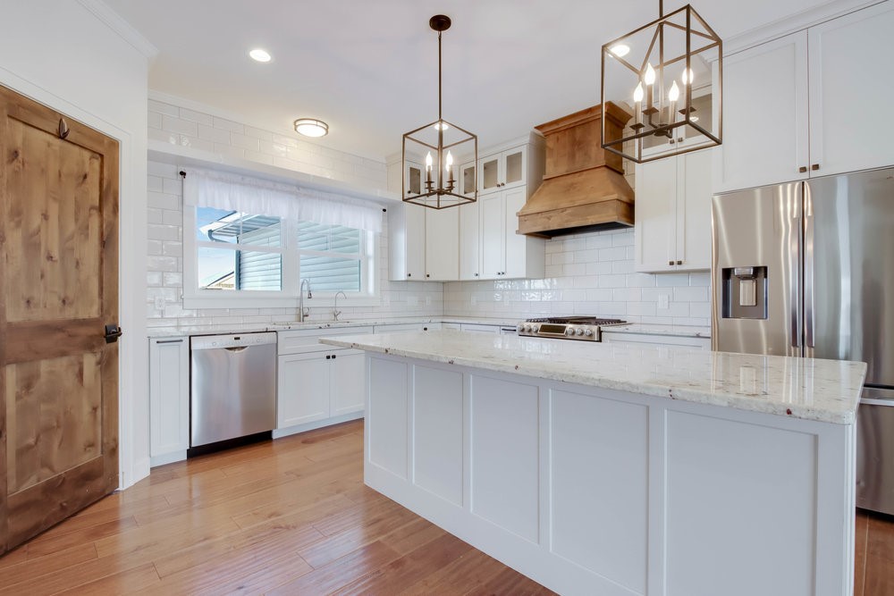 The kitchen features high-end luxury countertops, custom-designed cabinetry, and an elegant custom hood, all complemented by a convenient, generously sized walk-in pantry.