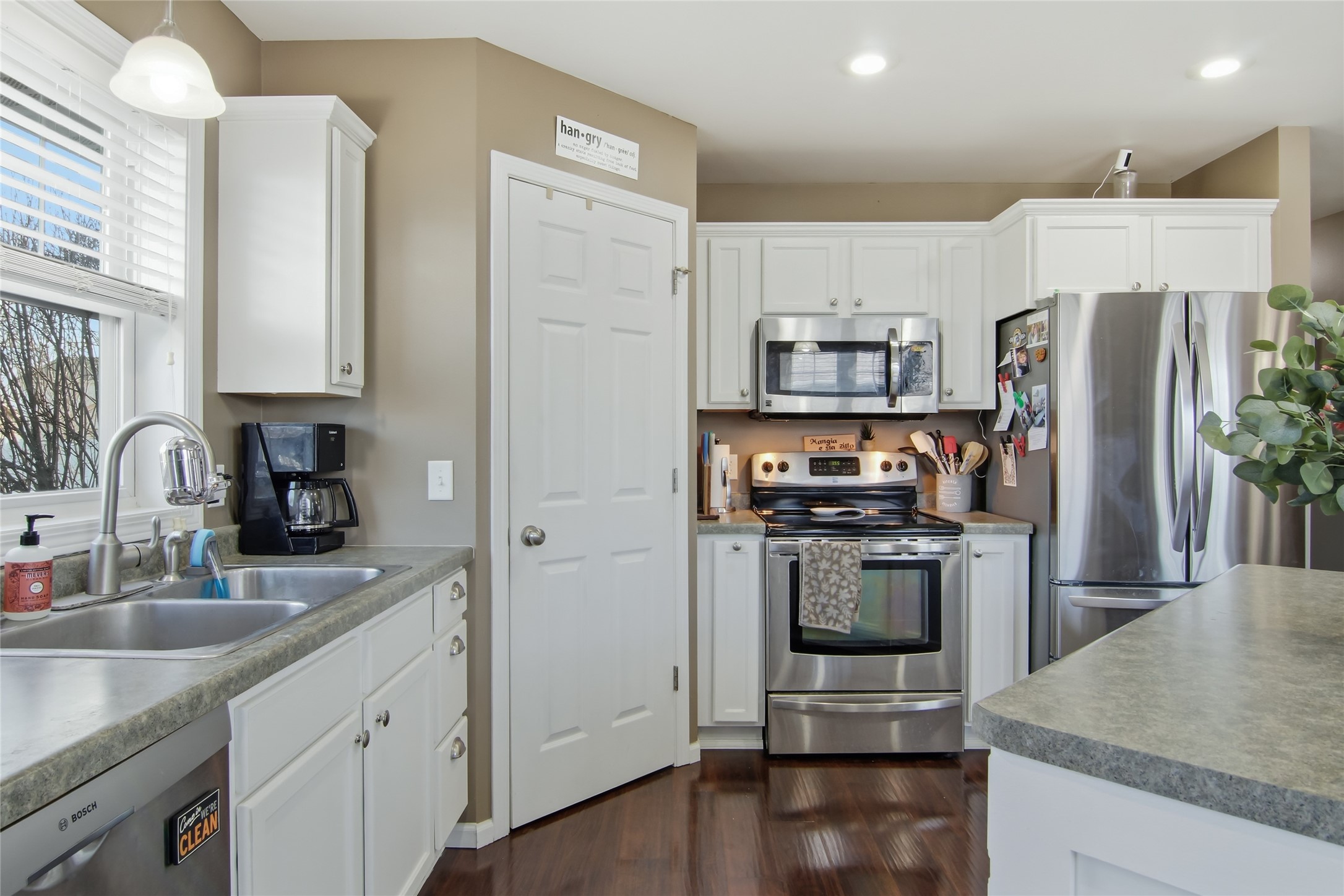 The heart of the home is a sparkling kitchen featuring white cabinetry, a large island, a pantry, and updated appliances including a new dishwasher (2022) and refrigerator (2024).