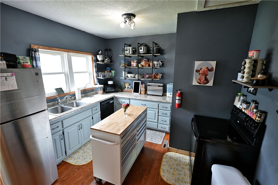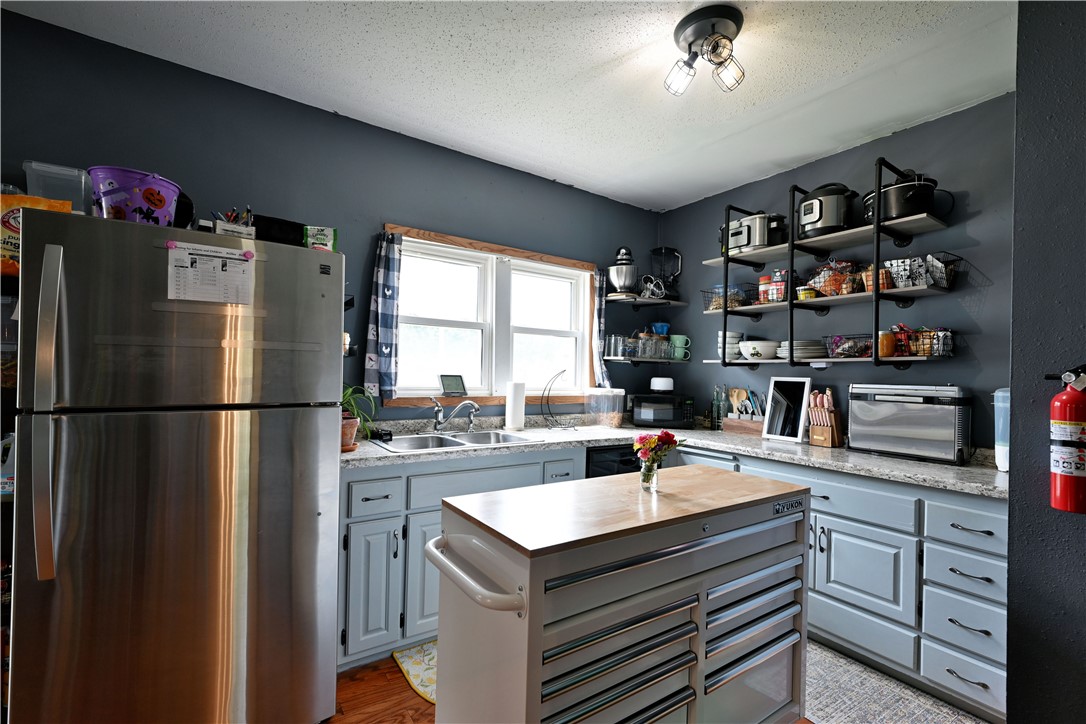 Small office has been constructed on the inside - this is the perfect workshop and space for all your vehicles and toys! The home itself has been lovingly maintained with recent updates including new vanity and bathtub in bathroom, drywall painting throughout, and new cabinets/shelving in the kitchen.