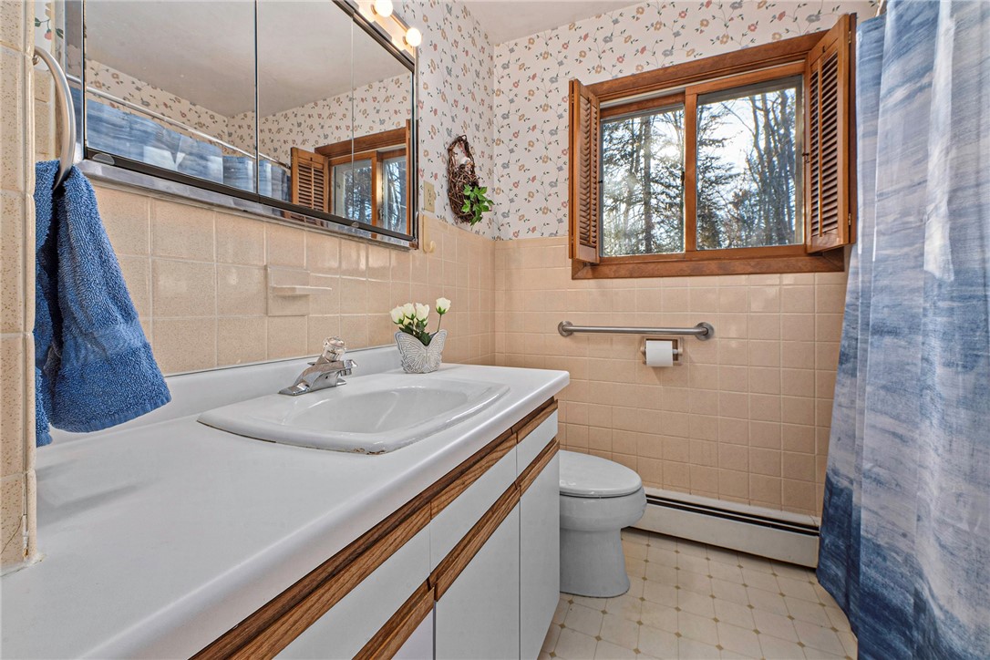 Back inside, a tiled hallway guides you to three spacious main-floor bedrooms and two full baths, ensuring effortless single-level comfort.