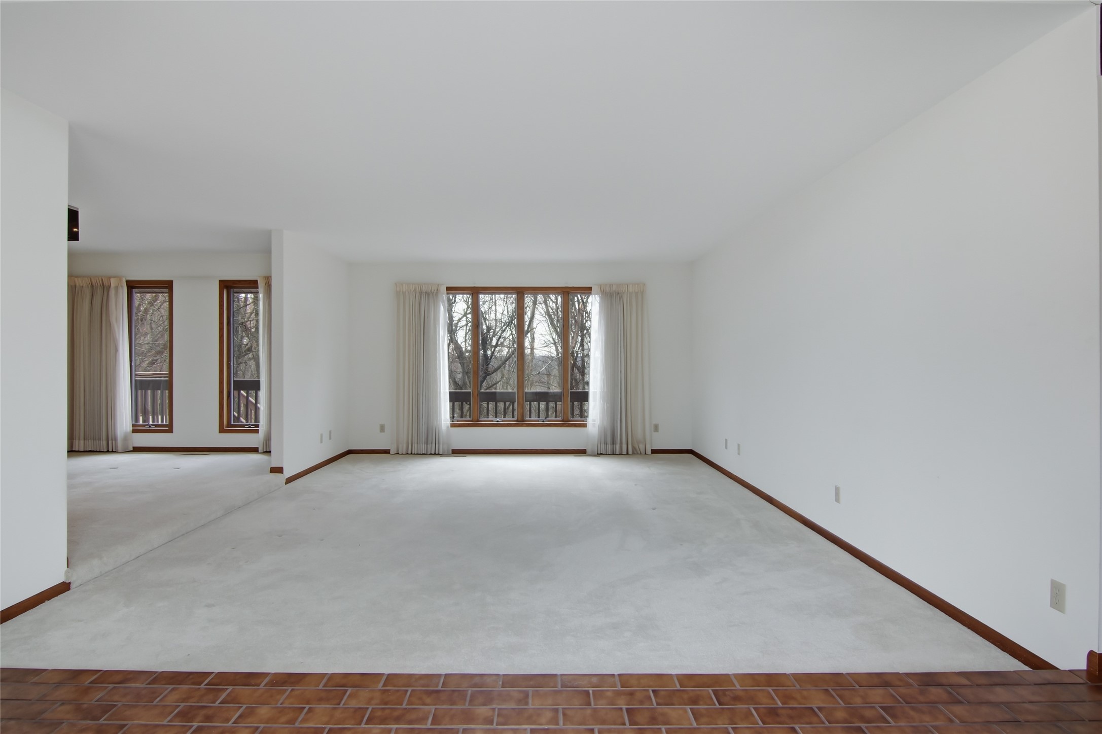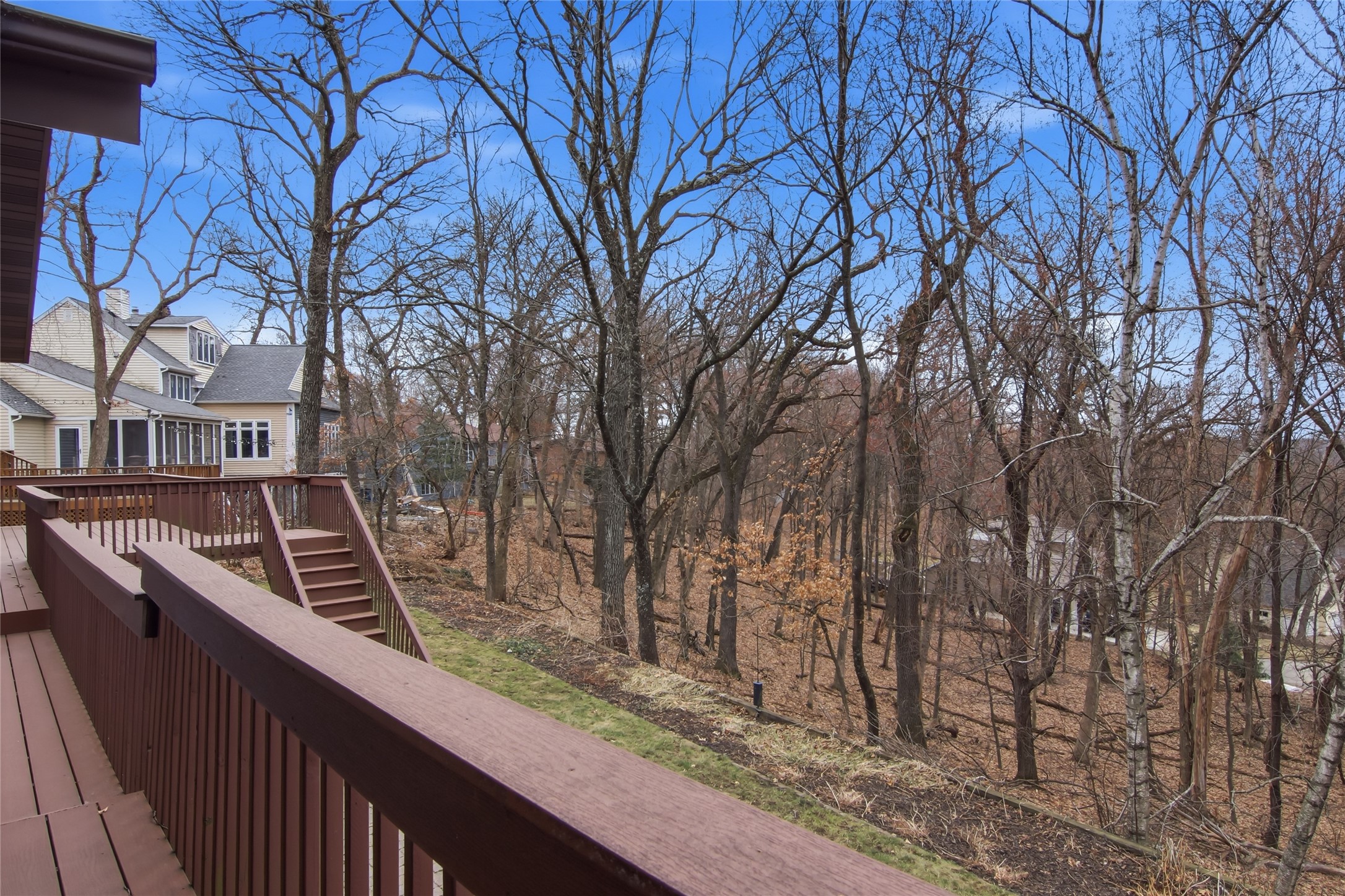 Step outside and enjoy the beautifully designed composite deck, perfect for relaxing or entertaining, overlooking a private wooded backyard that offers both tranquility and natural beauty.