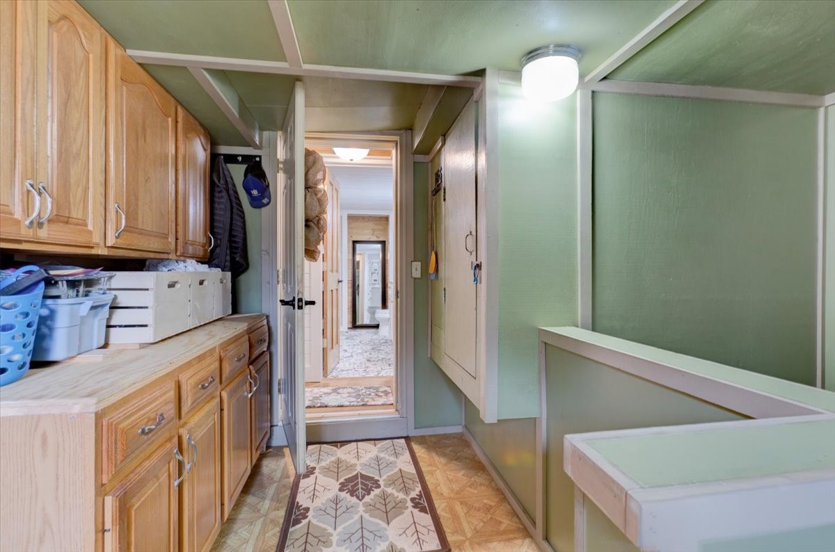 A back entry with built-in storage and cabinetry leads to the attached two-car garage, which also connects to a large storage/utility room.