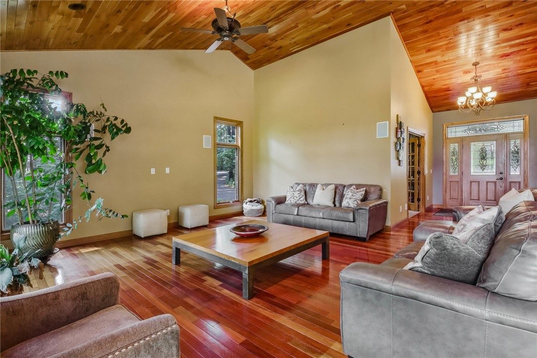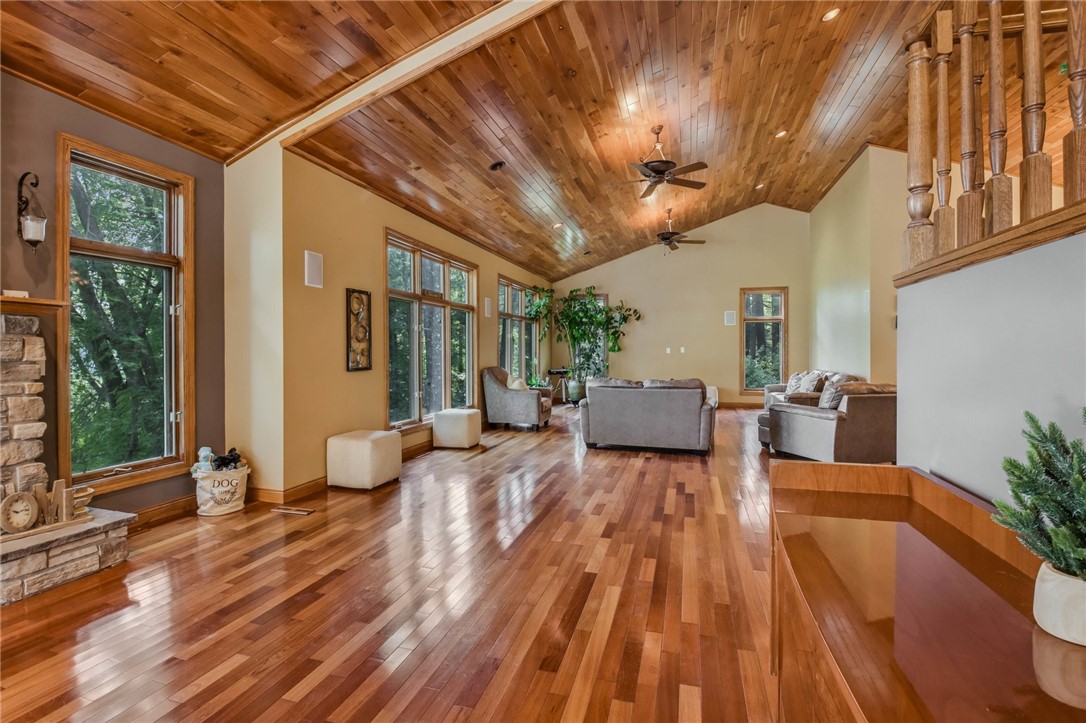 The main floor includes a nice office area, spacious laundry, kitchen w/large island and is well done with walkout from dining to deck, living room has gorgeous wood floors, gas fireplace and an extended area for huge sofas, relaxation and entertainment.