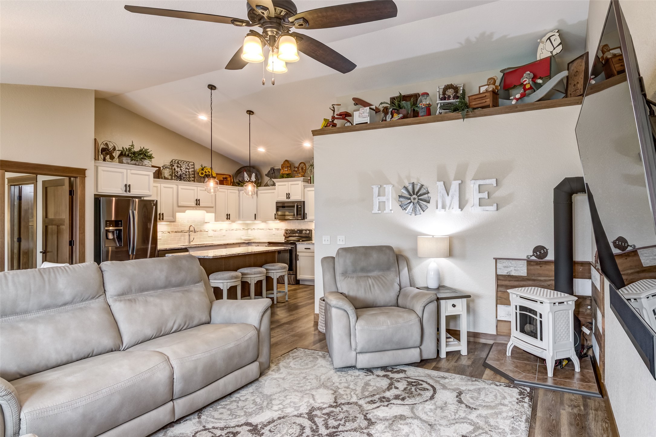 Heated and insulated garage has plenty of shelves and a 220 outlet.