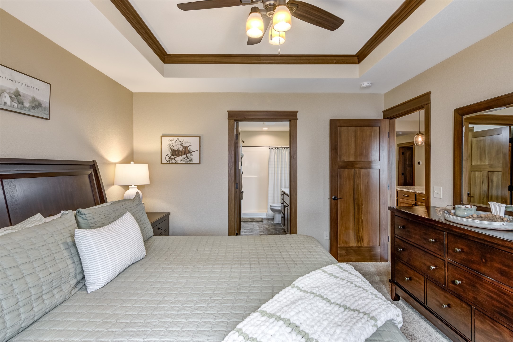 Owners suite has a tray ceiling with wood inlay, full bathroom, and walk-in closet.