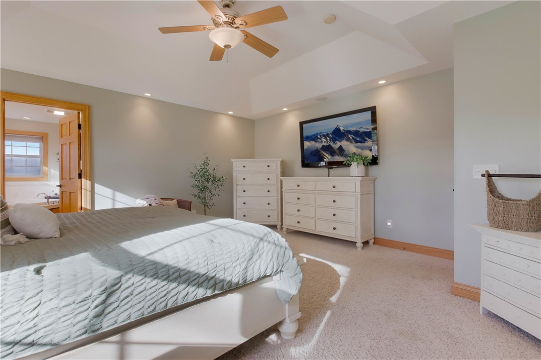 The expansive primary suite features elegant tray ceilings, a large walk-in closet, and a spa-inspired bath complete with a jetted tub and walk-in shower.