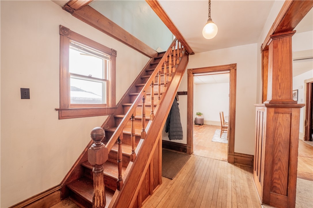 Inside, you’ll find large rooms, some wood floors, and a beautiful staircase with a classic banister that creates a strong focal point.