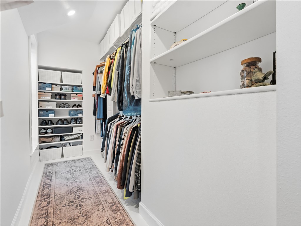 An adjacent office nook w/unique raw edge wood desk provides the perfect workspace.