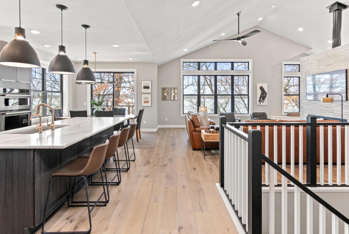 Step inside to an open-concept main level highlighted by vaulted ceilings, expansive windows, and stunning 180 degree lake views that flood the home with natural light.