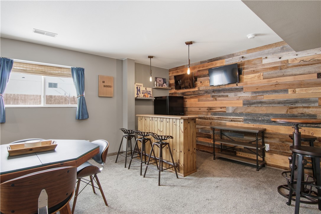 The lower level has sleek polished concrete floors, an extra-large family room with cozy carpeting, an additional bedroom and stylish office.