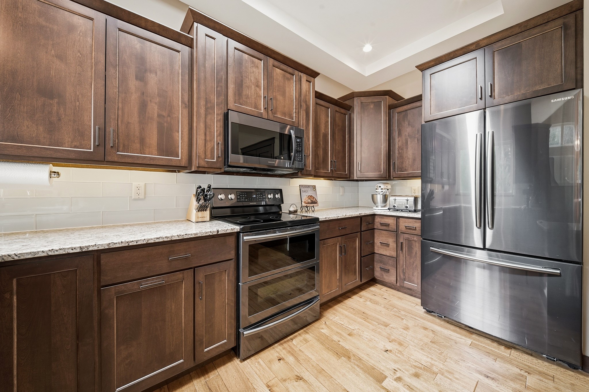 Gleaming hickory floors lead you to the owner’s suite, a true sanctuary featuring a massive 15x6 walk-in closet and a spa-like bathroom with quartz countertops, double sinks, and a separate soaking tub and shower.
