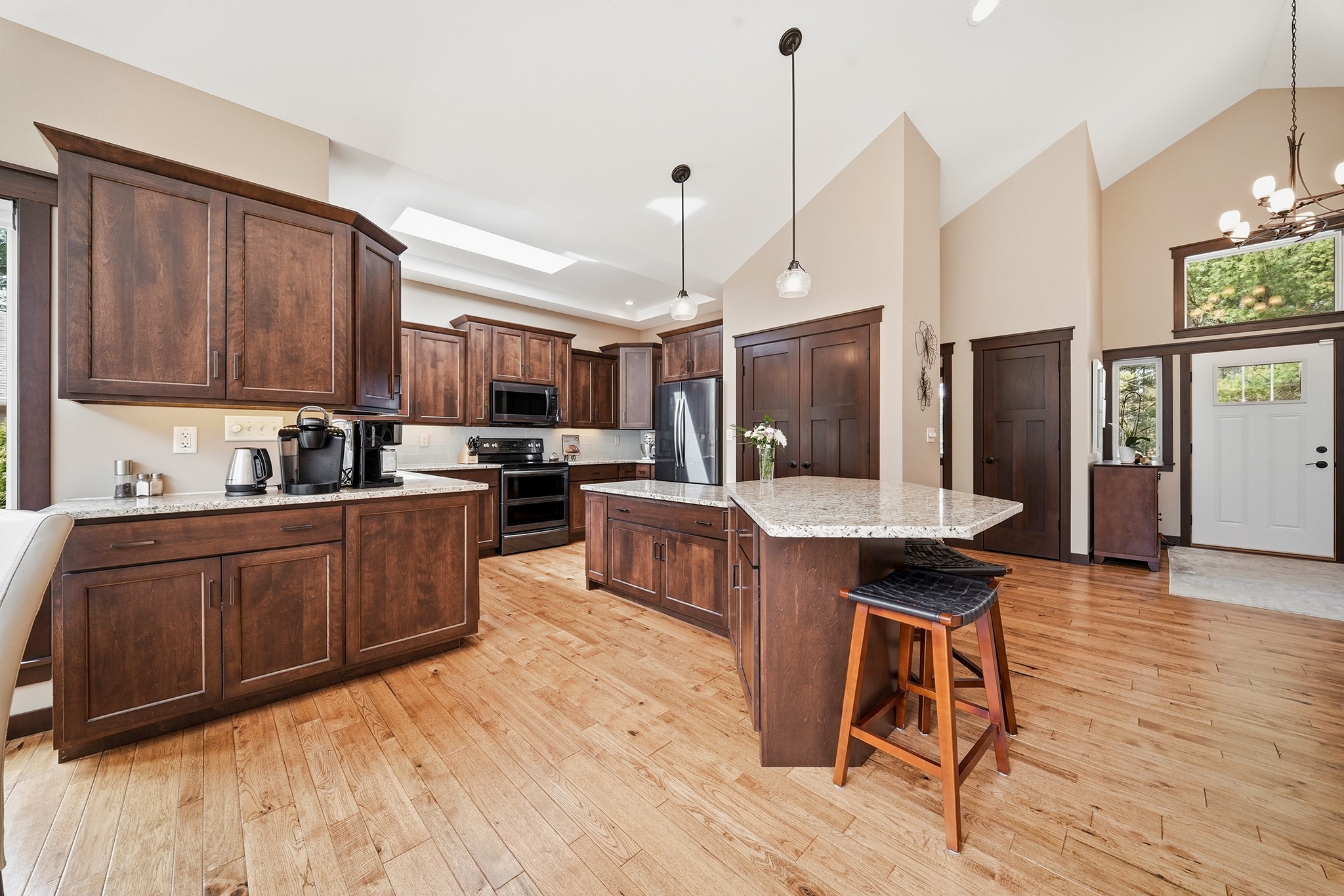 The gourmet kitchen is a chef’s dream, outfitted with custom birchwood cabinetry, granite countertops, a large center island, double ovens, and a dedicated coffee/wine bar for effortless entertaining.