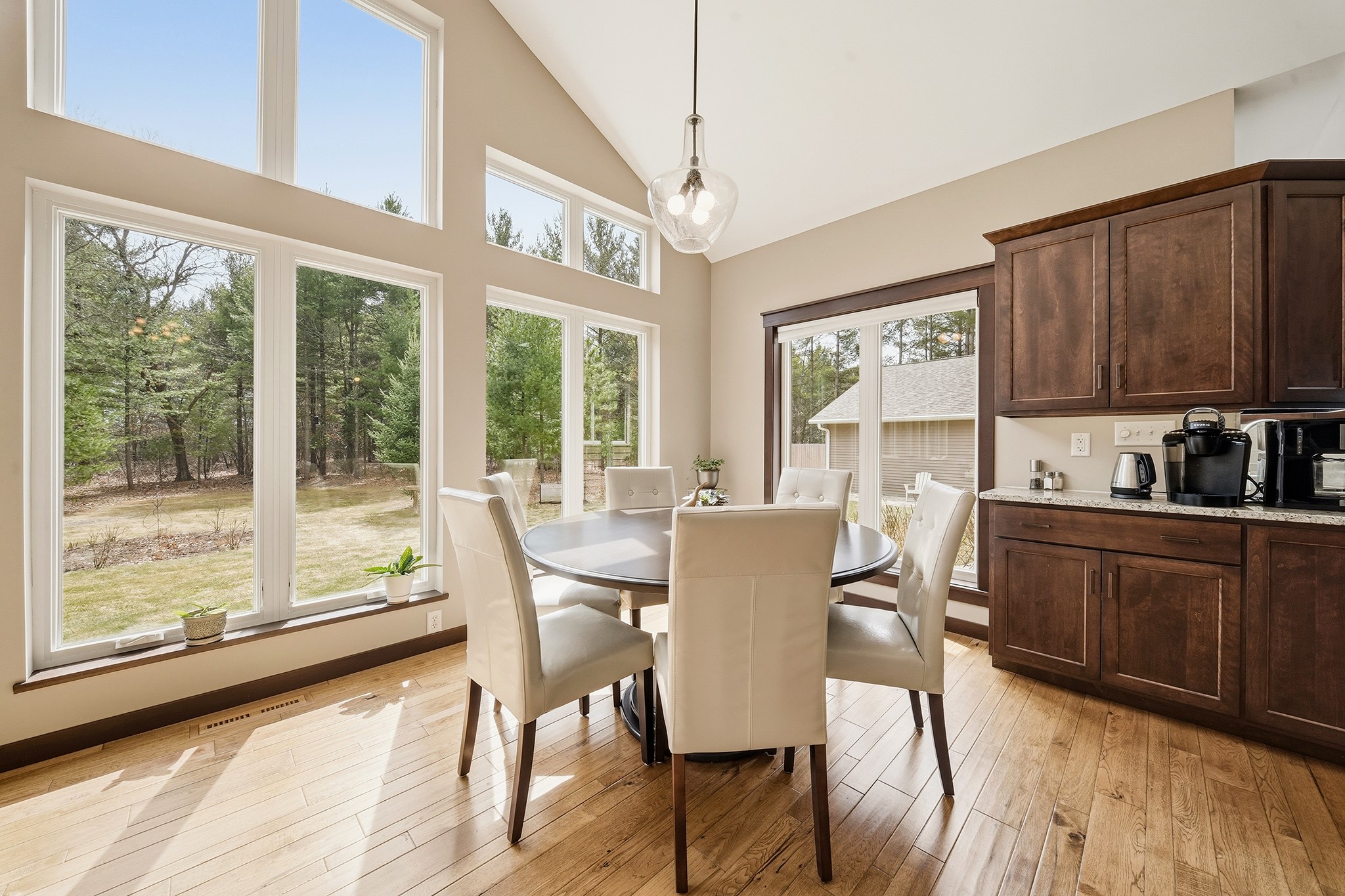 The stunning great room serves as the heart of the home, featuring soaring floor-to-ceiling Marvin windows that frame the surrounding forest and a wood-burning fireplace with a custom mantle crafted from wood sourced directly from the property.