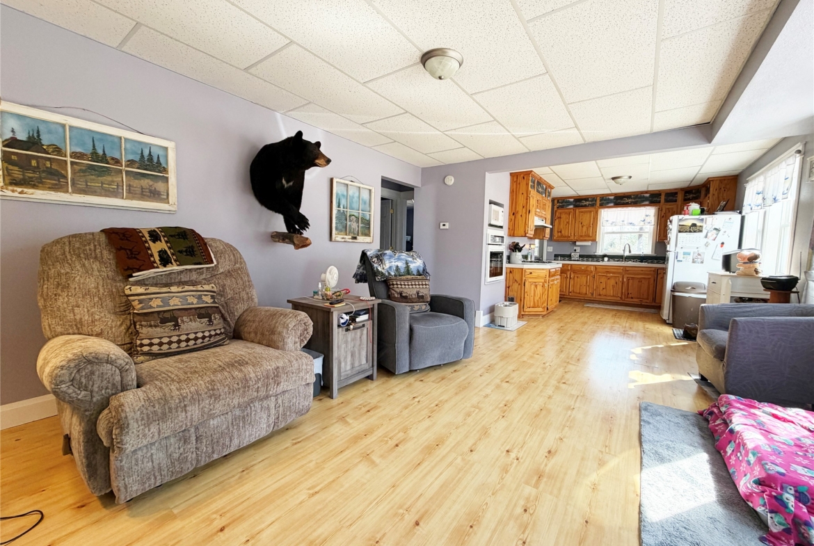 The main level features two bedrooms and a spacious living room filled with great natural light, creating a warm and inviting atmosphere.