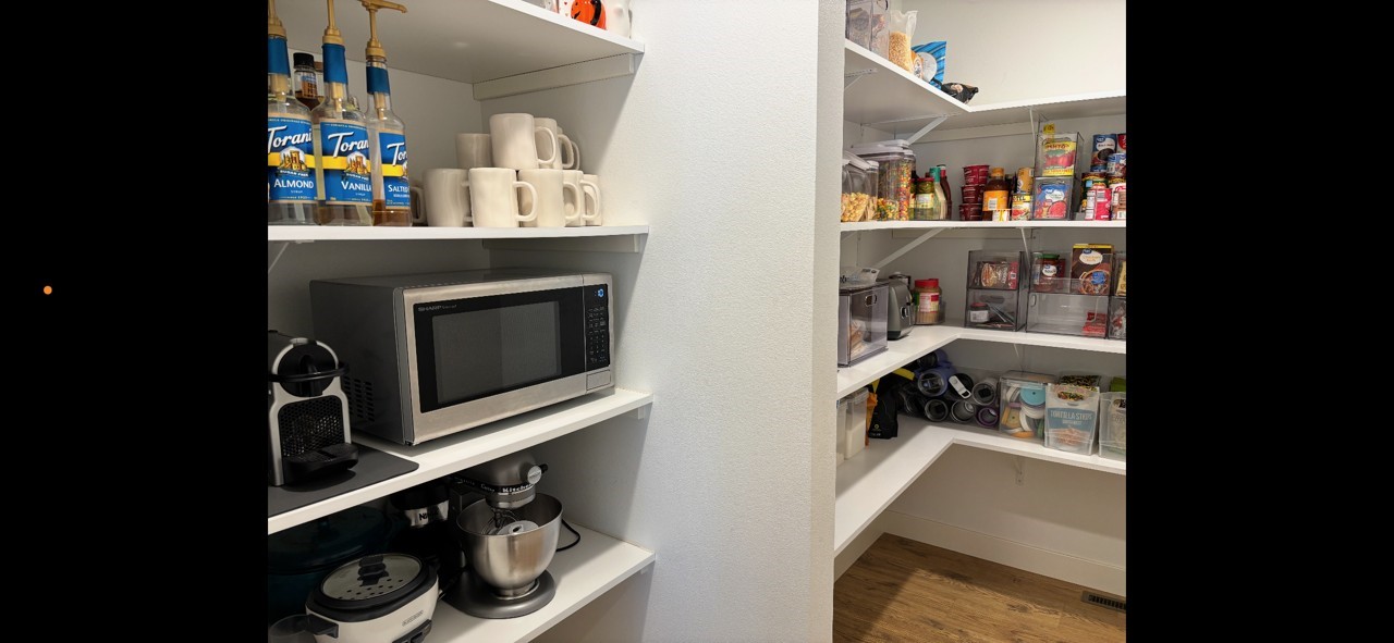 Custom kitchen with quartz countertops and spacious walk in pantry.
