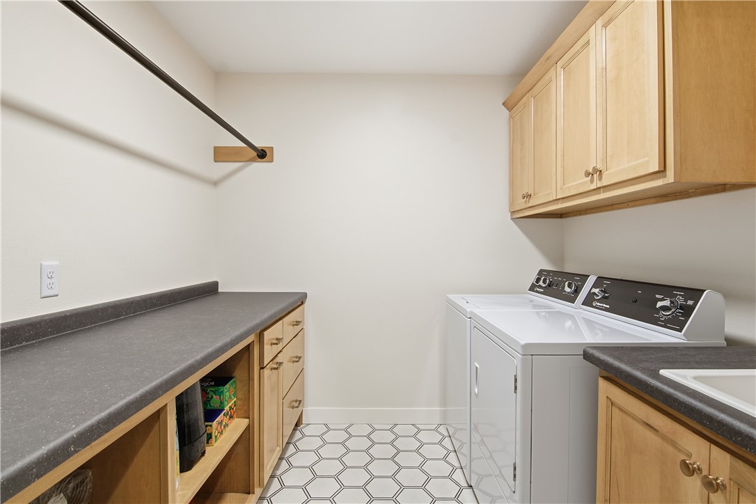 Separate first floor laundry off mudroom with custom cubbies, cabinets and hanging racks.