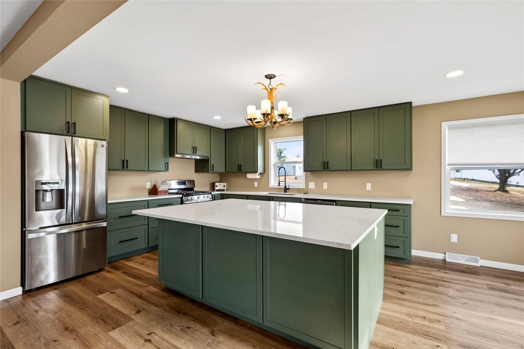 Extensively updated throughout with high-end finishes, the home showcases luxury vinyl plank flooring, fresh paint, new doors and trim, a remodeled kitchen with quarts countertops, and updated bathrooms.