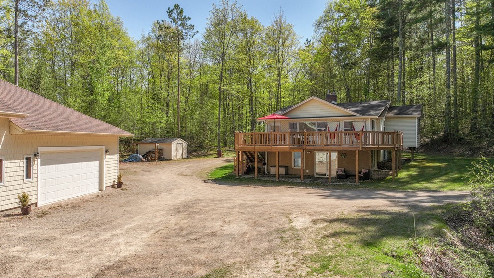 Set on a wooded lot, the property features a spacious 30x60 garage complete with workshop, large loft, and plumbing for in-floor heat.