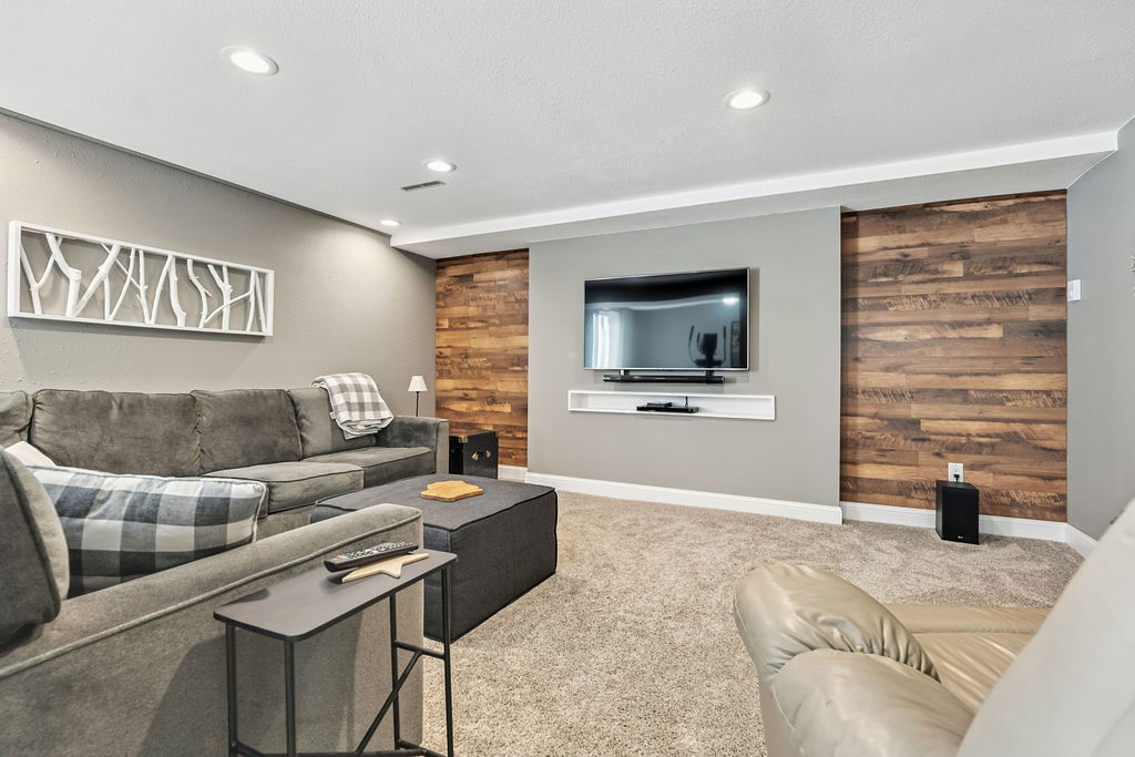 Walk-out lower-level rec room with wet bar.